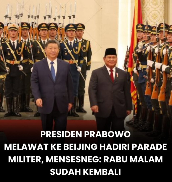 Presiden Republik Indonesia, Prabowo Subianto, melakukan kunjungan singkat ke Beijing, Tiongkok, untuk memenuhi undangan resmi Presiden Xi Jinping menghadiri parade militer angkatan bersenjata China pada Rabu (3/9). Prabowo berangkat dari Base Ops Pangkalan Udara TNI AU Halim Perdanakusuma, Jakarta, didampingi Sekretaris Kabinet Teddy Indra Wijaya. Menteri Sekretaris Negara Prasetyo Hadi menjelaskan, undangan Presiden Xi sebenarnya ditujukan agar Prabowo hadir sejak 31 Agustus, namun keberangkatan ditunda karena adanya dinamika penting di dalam negeri yang harus lebih dahulu diselesaikan. Prasetyo menekankan bahwa kunjungan ini bersifat khusus dan simbolis, mencerminkan hubungan diplomatik yang semakin erat antara Indonesia dan Tiongkok, khususnya dalam bidang pertahanan dan kerja sama strategis. Kehadiran Presiden Prabowo pada acara berskala internasional ini juga diartikan sebagai bentuk penghormatan terhadap mitra dagang terbesar Indonesia sekaligus menegaskan posisi Indonesia dalam percaturan geopolitik kawasan. Dengan agenda yang padat, kunjungan ini lebih difokuskan pada pemenuhan undangan resmi tanpa pertemuan bilateral panjang, mengingat Presiden dijadwalkan segera kembali ke tanah air usai parade.
