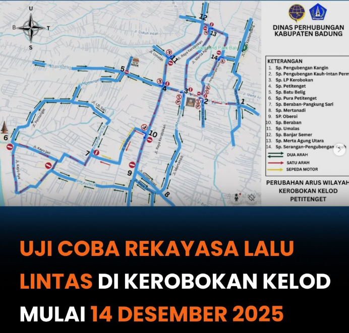 Pemerintah Kabupaten Badung akan mulai melaksanakan uji coba rekayasa lalu lintas di wilayah Kerobokan Kelod, Kecamatan Kuta Utara, pada Minggu, 14 Desember 2025, pukul 08.00 WITA. Uji coba ini direncanakan berlangsung maksimal satu bulan sebagai upaya mengurai kepadatan kendaraan di sejumlah titik yang selama ini menjadi kawasan padat mobilitas masyarakat dan wisatawan. Selama masa uji coba, sejumlah perubahan arus dan pengaturan jalur diberlakukan sesuai peta rekayasa lalu lintas yang telah diumumkan sebelumnya. Forum Lalu Lintas dan Angkutan Jalan Kabupaten Badung nantinya akan melakukan evaluasi menyeluruh terhadap dampak rekayasa tersebut, sebelum menetapkan apakah pola arus baru itu akan diadopsi secara permanen.